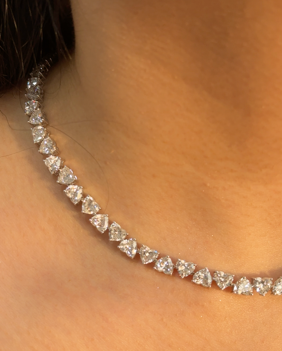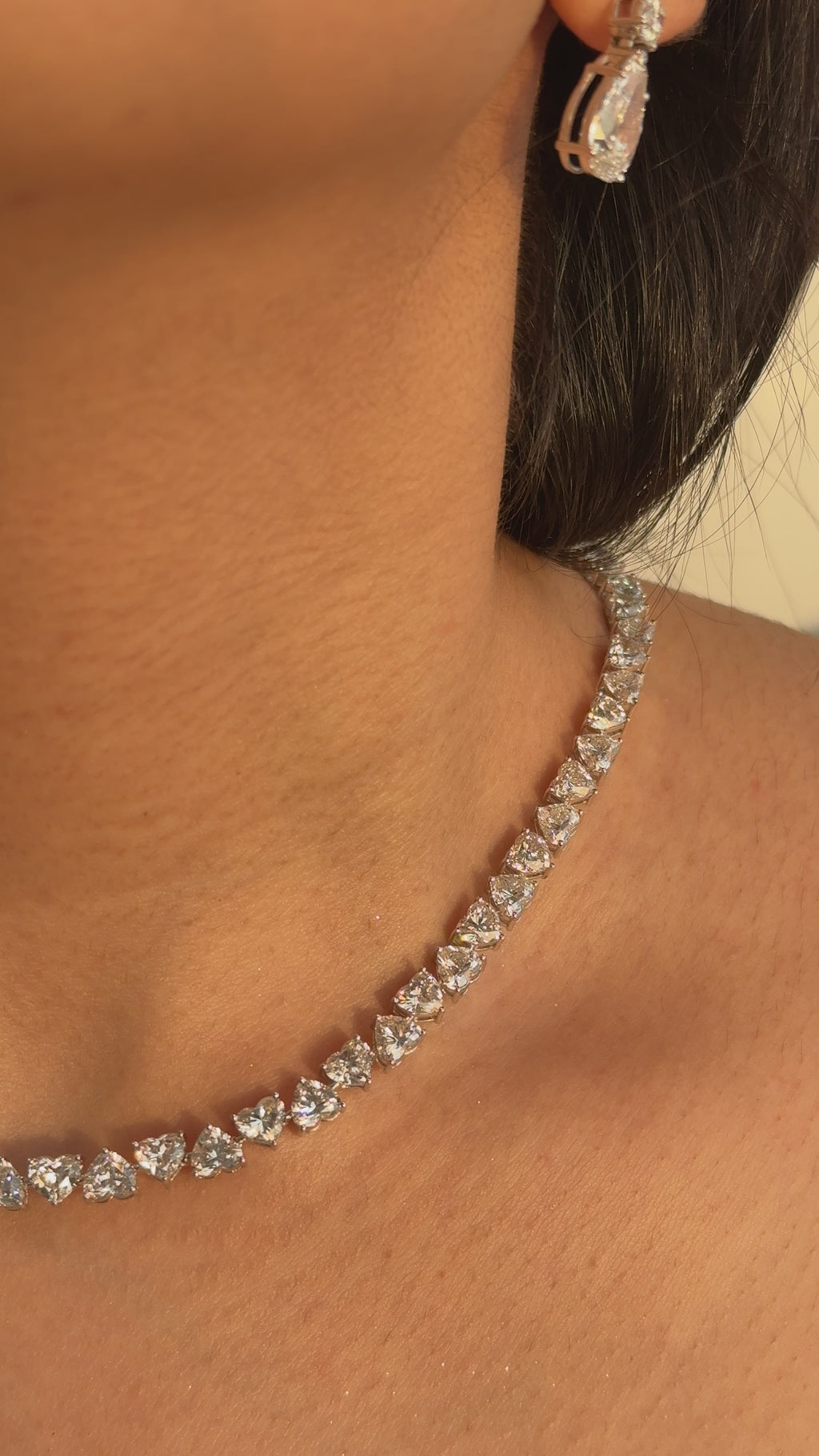Crafted in 18K white gold, the necklace weighs 30.98 grams gross and is set with 35.93 carats of EF colour diamonds, each with VVS to VS clarity for unrivalled brilliance. The heart-cut stones, radiant in their precision, capture both elegance and whimsy, resulting in a piece that feels timeless yet refreshingly modern.