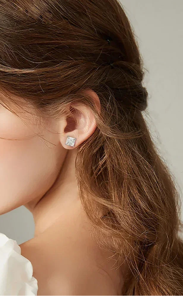 To preserve the brilliance of your Asscher Allure Studs, avoid direct contact with water, perfumes, and harsh chemicals. After each wear, gently clean with a soft cloth and store them in a velvet-lined box to maintain their lasting elegance.