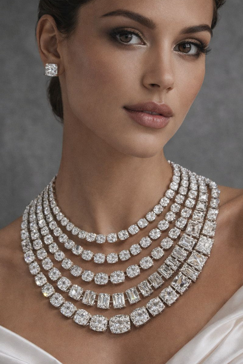 Lumière Royale is an ode to old-world glamour, reimagined with modern precision. Multiple graduated rows of impeccably matched diamonds rest elegantly along the collarbone, creating depth, rhythm, and a commanding sense of presence.