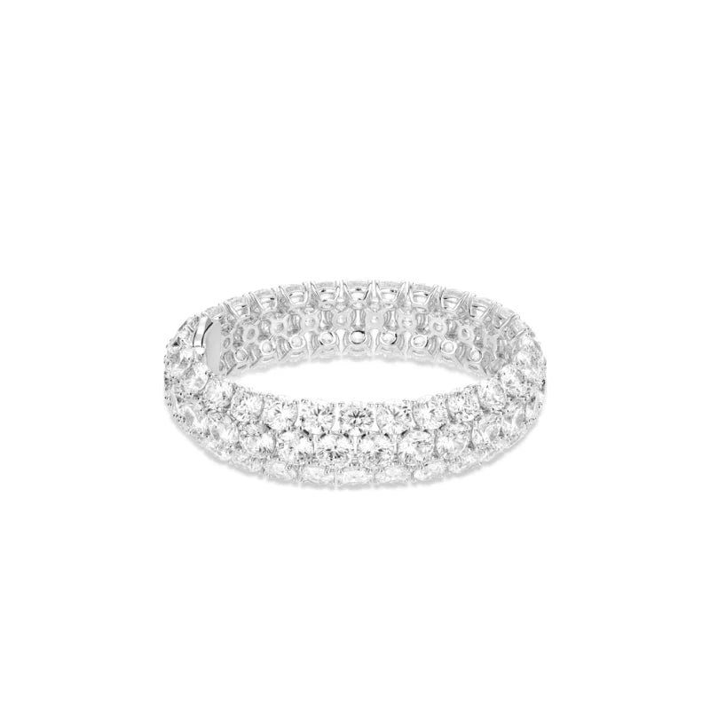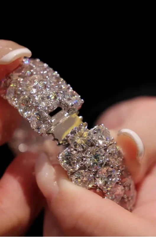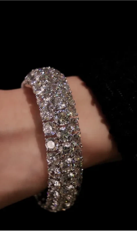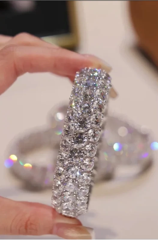 Adorned with luminous lab-created white sapphires, each stone sparkles with a clarity and grace that mirrors stars emerging in the evening sky. Weighing 65.84 grams, the bangle offers a substantial yet elegant presence, wrapping the wrist in a radiant embrace that whispers mystery and timeless beauty.