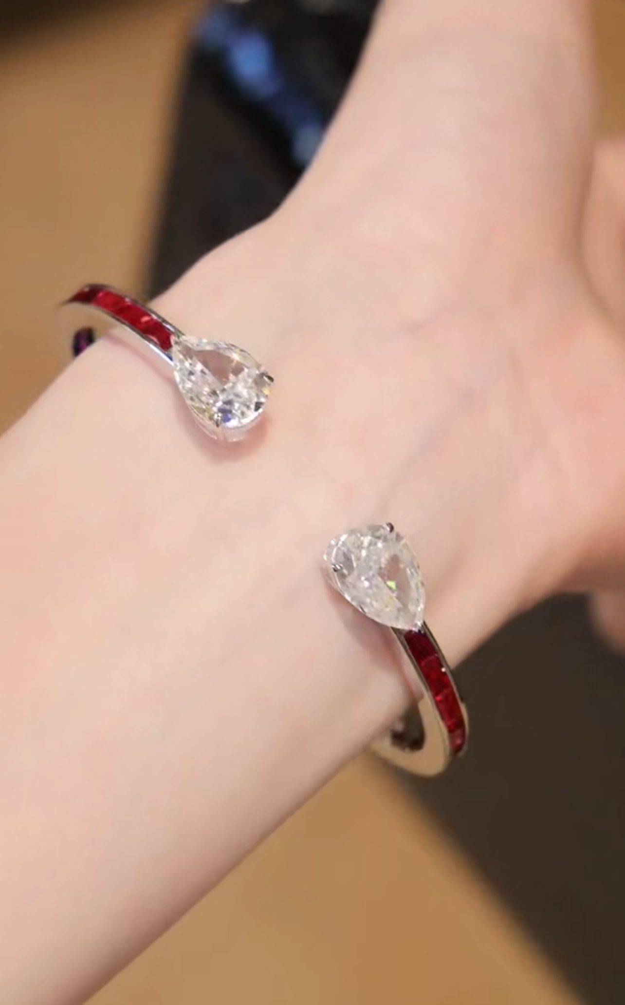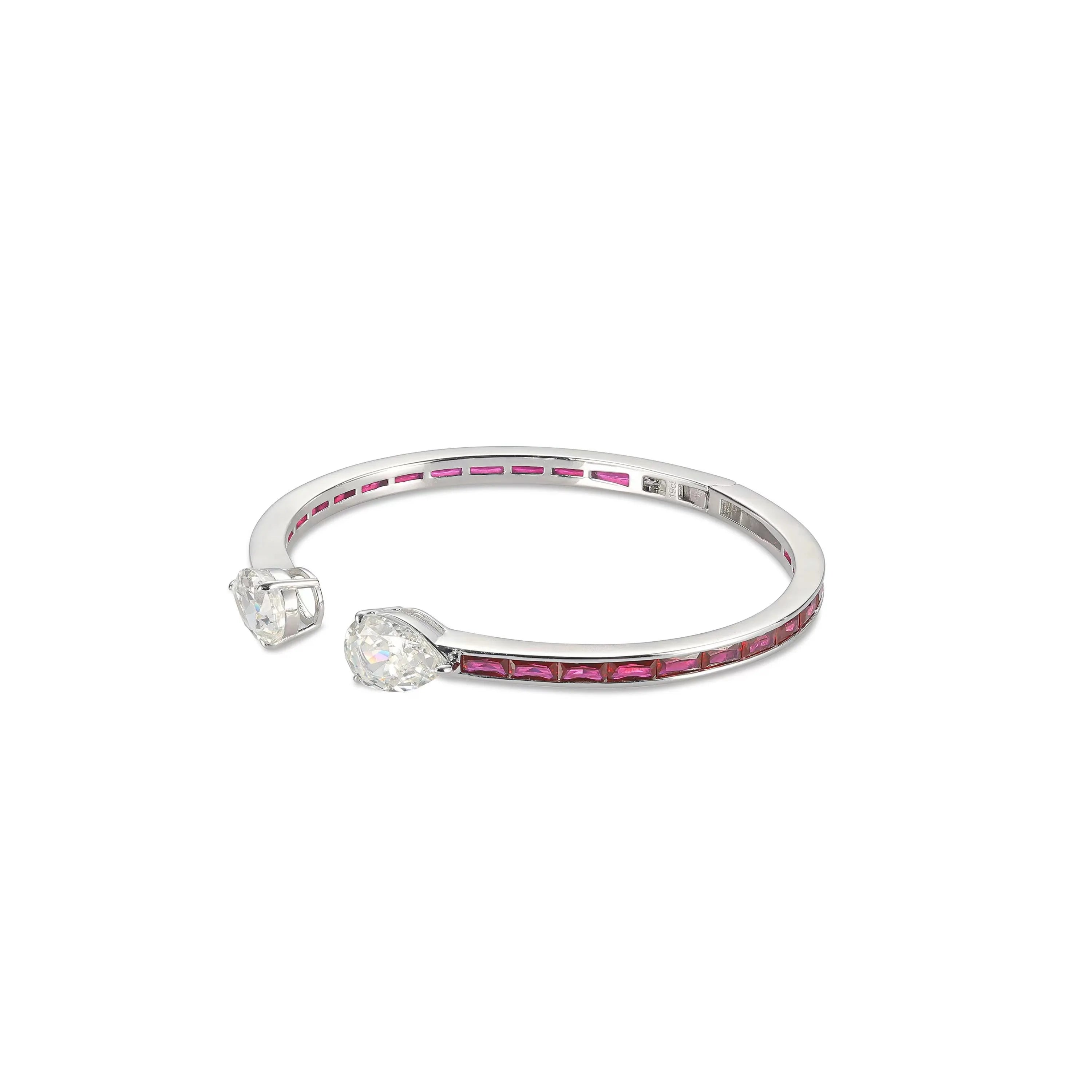 The Ruby Tear Bangle captures emotion in motion. Crafted in 925 sterling silver and platinum plated for a cool, luminous finish, this 15-gram bangle features pear-shaped lab-created sapphires in rich ruby tones, designed to echo the timeless elegance of teardrops in mid-fall.