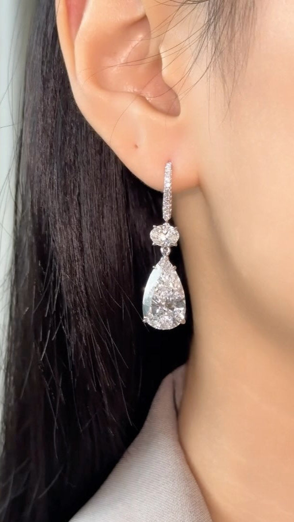 Ethereal and regal, the Crowned Dewdrop Earrings embody the splendour of nature’s most delicate treasures, transformed into jewels of timeless majesty. Each earring is adorned with a luminous 10-carat pear-cut lab diamond, its teardrop silhouette reminiscent of morning dew kissed by first light. Above it rests a radiant 1-carat oval-cut diamond, a crown-like accent that completes the composition with graceful poise.
