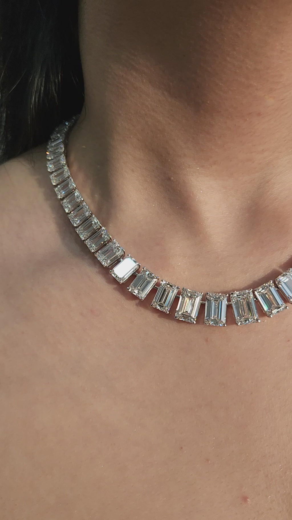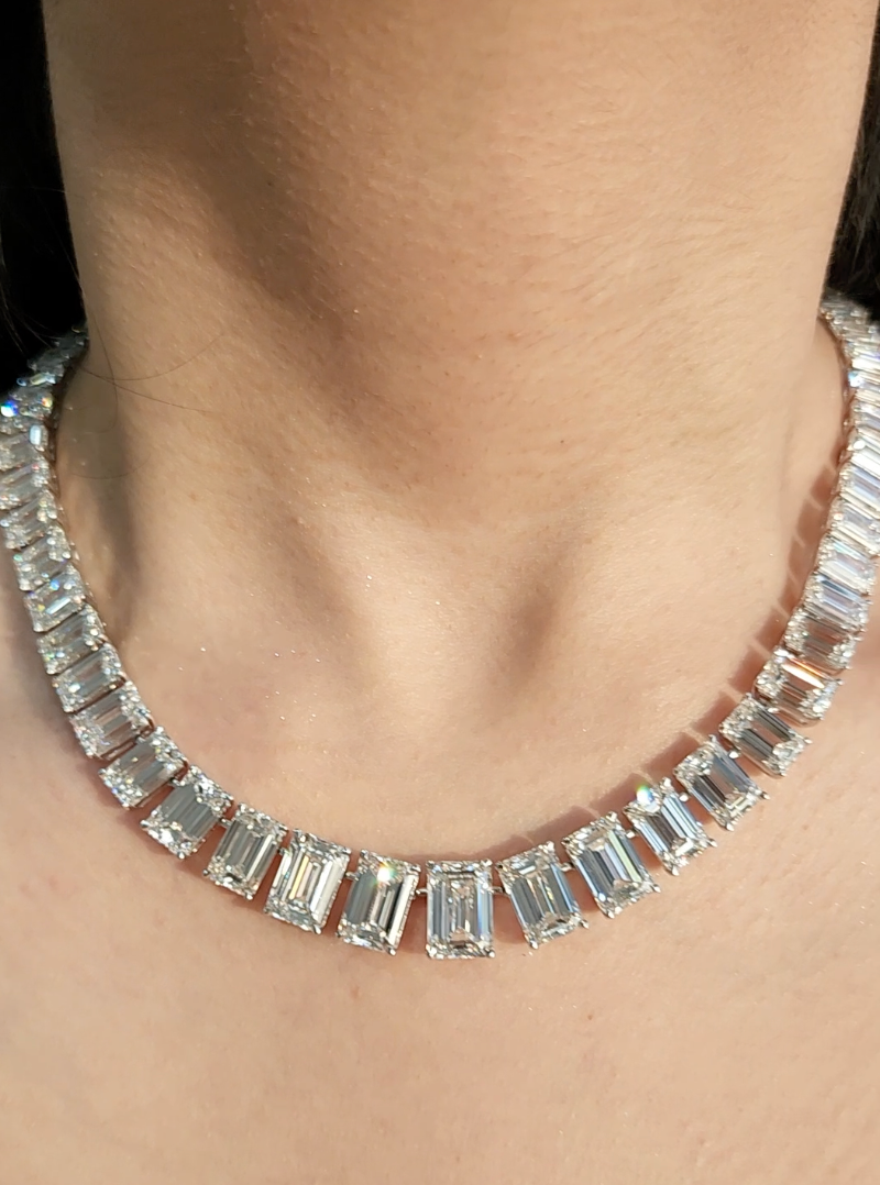 Radiant and commanding, the Aurora Émeraude Tennis Necklace is a masterpiece of timeless elegance and modern craftsmanship. Certified by the International Gemological Institute, this extraordinary necklace features a breathtaking arrangement of emerald-cut lab-grown diamonds, each ranging from one to five carats. Together, they create a seamless cascade of brilliance, resulting in an impressive total carat weight of 107.13 carats.