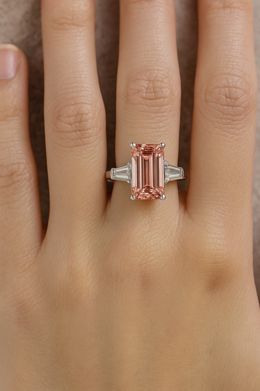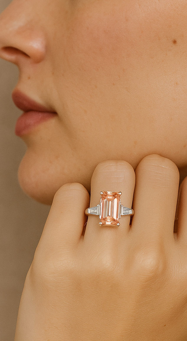 Bathed in a soft, romantic pink hue, the Peach Serenade Ring captures the gentle warmth of a sunset melody. Crafted in 18K white gold, this exquisite engagement ring features three stunning lab-grown diamonds, each emerald cut to reflect light with a serene brilliance, totalling 5.83 carats. The graceful arrangement of the stones sings a harmonious serenade of love, promise, and timeless beauty. Weighing 4.96 grams, the ring balances elegance and presence, making it a radiant symbol of commitment and delicate passion.