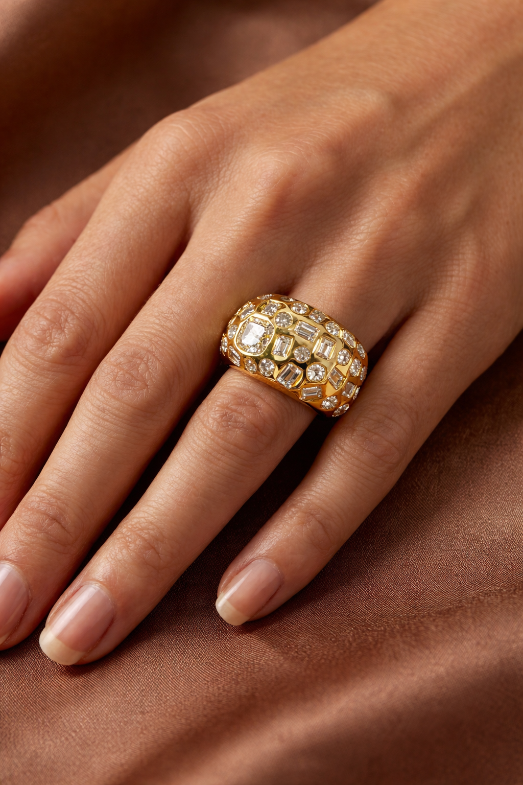 This ring is all about controlled chaos done beautifully. The Gilded Constellation Ring features a sculptural gold dome scattered with mixed-cut lab diamonds, each stone set like a star across a golden sky. Round brilliants, baguettes, and square cuts come together in an intentional yet organic pattern that feels modern, bold, and quietly powerful.