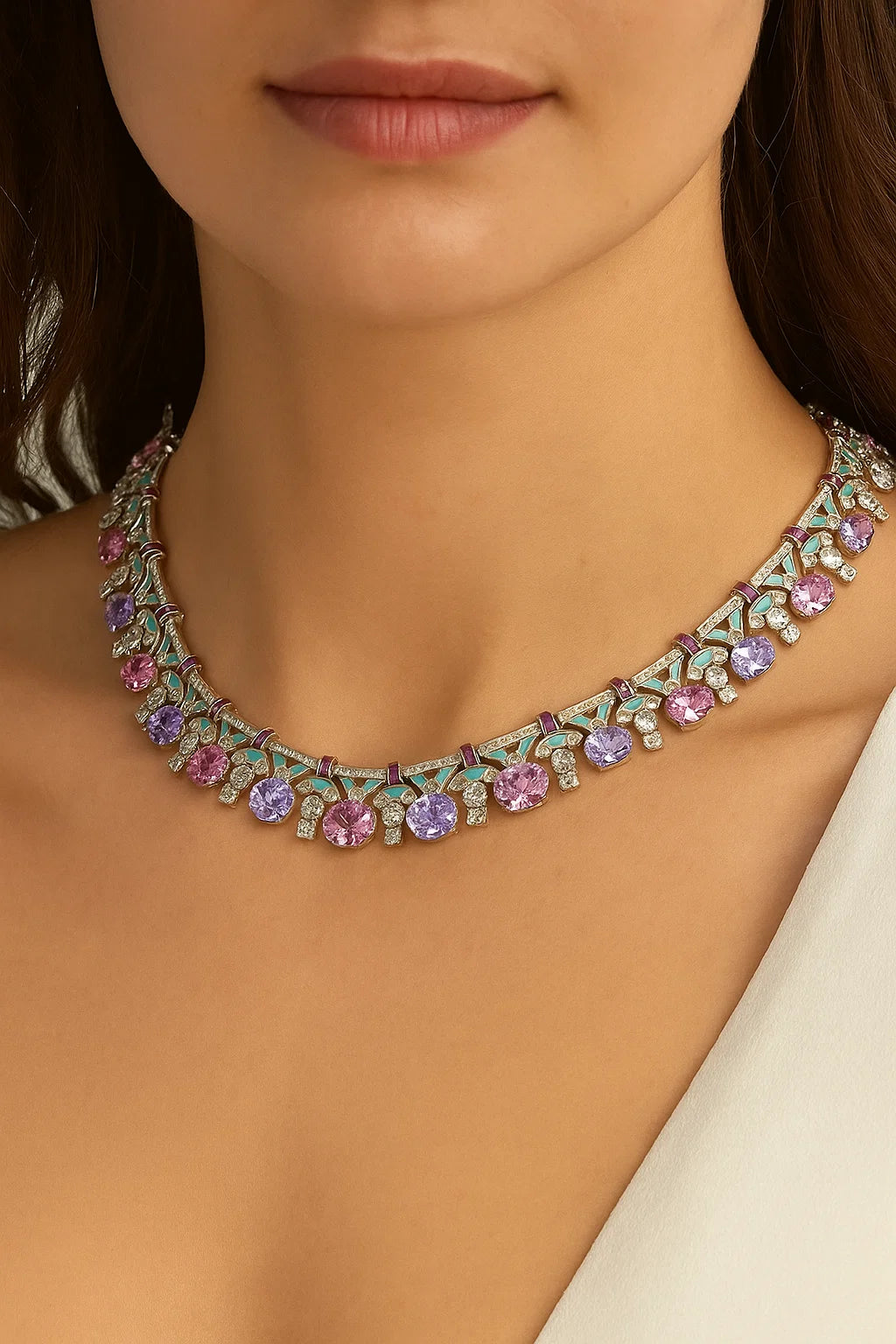 The Rosy Mirage Necklace Suite feels like a daydream spun into jewels. A delicate choker bathed in shades of pink and purple, it shimmers with the soft magic of sunset skies and rose-tinted memories. Crafted from copper and silver, the necklace effortlessly hugs the neckline, while the matching earrings complete the set like whispered secrets.