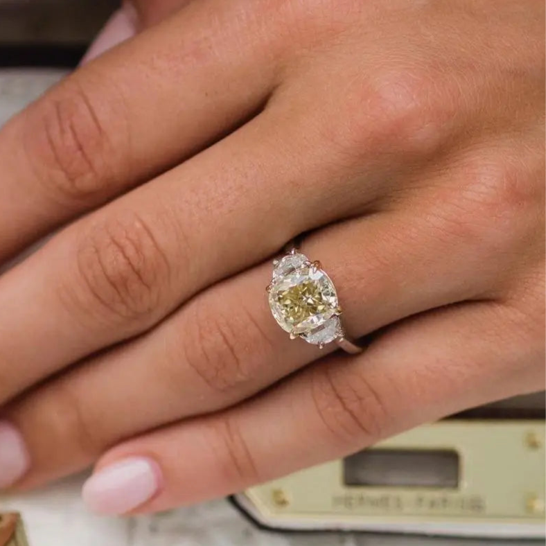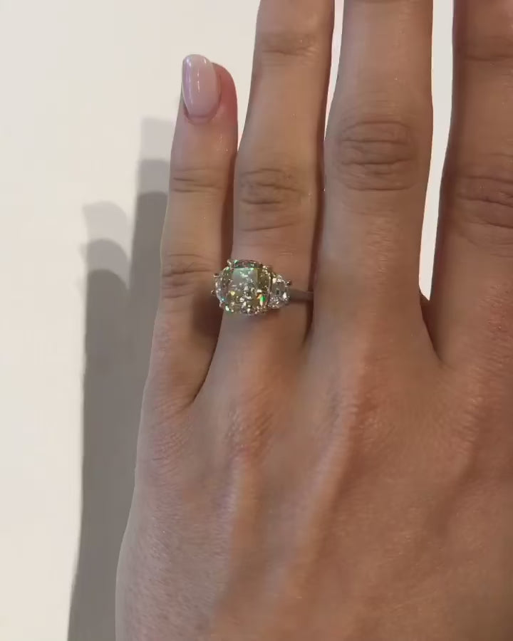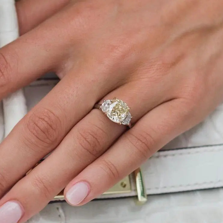 Radiating warmth, brilliance, and regal charm, the Aurelia Halo Ring captures the essence of timeless romance with a modern twist. At its heart lies a captivating 3-carat cushion-cut Moissanite, measuring 9x8mm, its golden-yellow centre stone exuding a rich, sunlit glow. This luminous focal point is framed by a delicate halo of dazzling white Moissanites, while two perfectly matched side stones enhance its brilliance and create a balanced, harmonious silhouette.