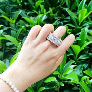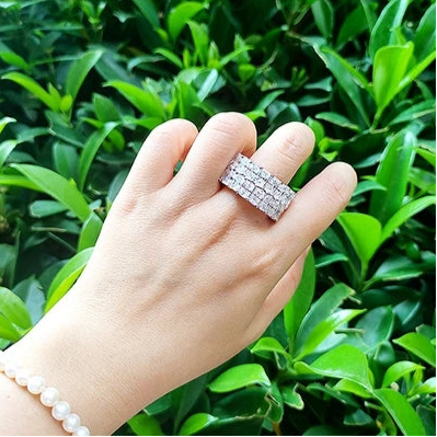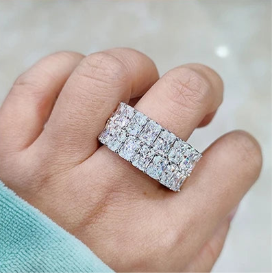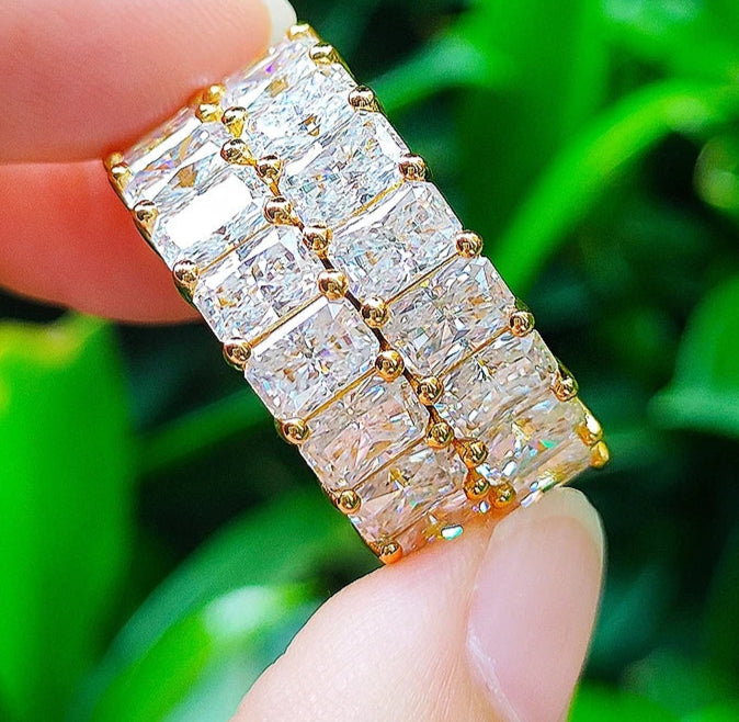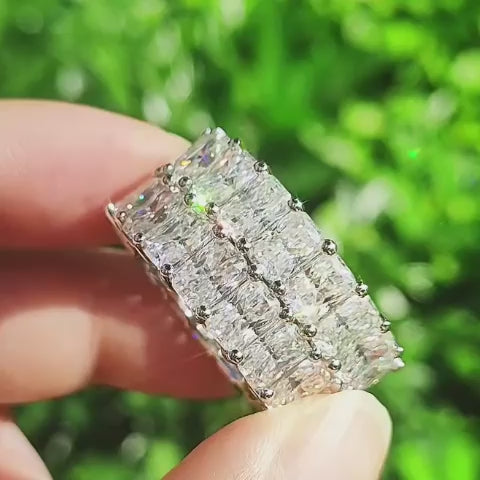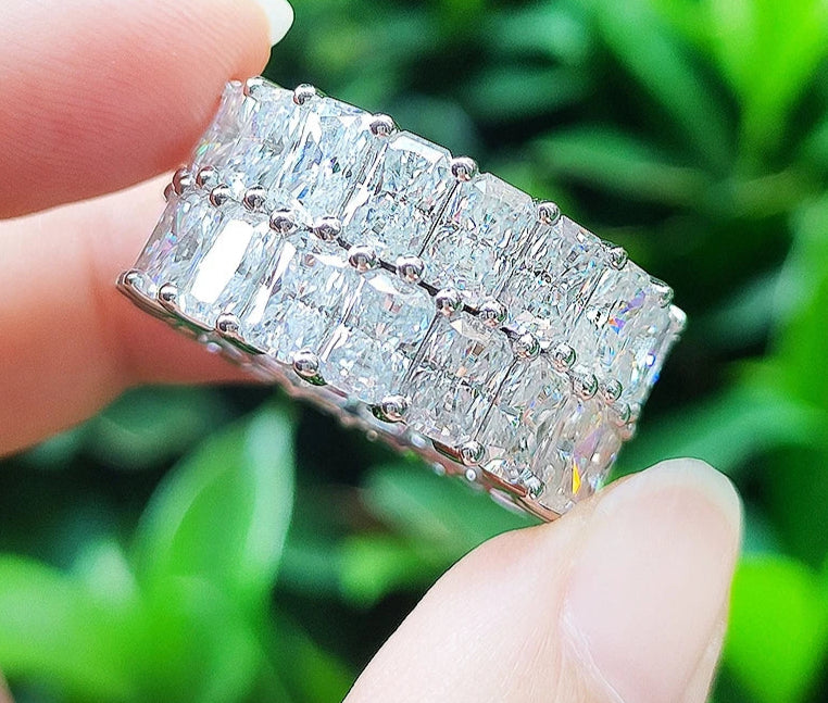 Crafted in 925 sterling silver the band features two continuous rows of radiant cut moissanite stones each one precisely shaped in a 4 by 6 millimetre silhouette. The moissanites shimmer in D colour VVS1 clarity their brilliance elevated by a structured silver base that commands presence without overpowering. Round and pear shaped accents enhance the ring’s fluid geometry creating an interplay of light that shifts as you move.
