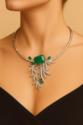 Sculptural sterling silver pendant necklace featuring emerald and white lab sapphires in a bamboo-inspired design.