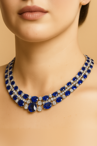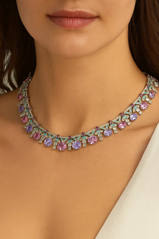 Rosy Mirage Necklace and earrings suite in pink and purple tones, featuring lab sapphires and a choker design with silver-copper finish.
