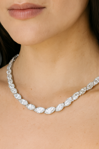 Marquise Cut Necklace featuring a lab sapphire in a marquise-shaped setting, crafted in 925 sterling silver with a delicate chain, displayed against a neutral backdrop.
