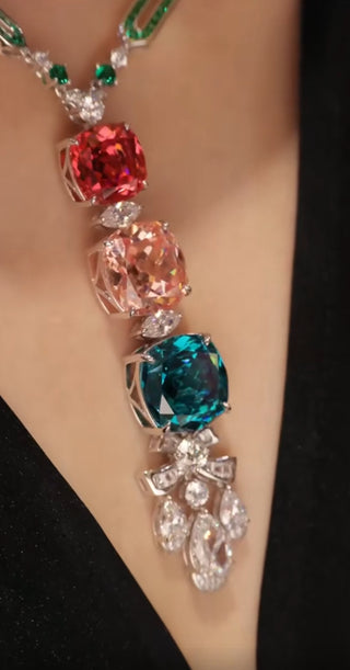 Crystal Cascade Pendant Necklace with lab sapphire and side stones, set in 925 sterling silver, capturing cascading elegance.