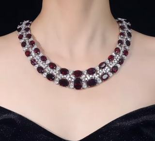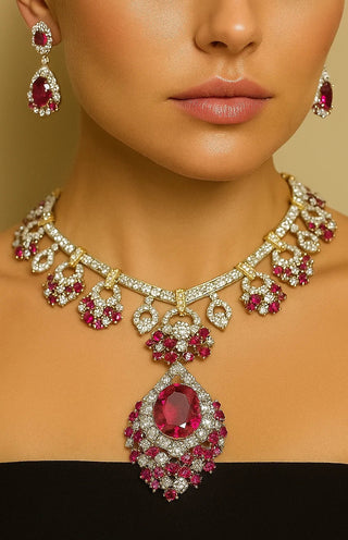Sterling silver long necklace with vivid ruby centrepiece and regal red tones — Azzallure Maharani Ruby Necklace inspired by royal Indian heritage.