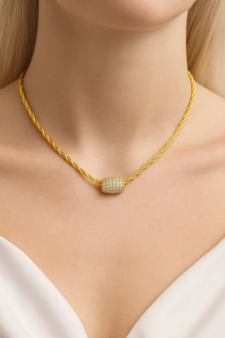 Golden Barrel Necklace in modern 22K gold design with lab sapphire centerpiece on sterling silver chain – elegant gold necklace for women