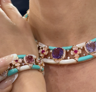 Lily’s Embrace Bracelet in 925 sterling silver featuring sculpted tulip petals, lab-created sapphires, and a central freshwater pearl