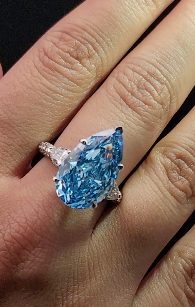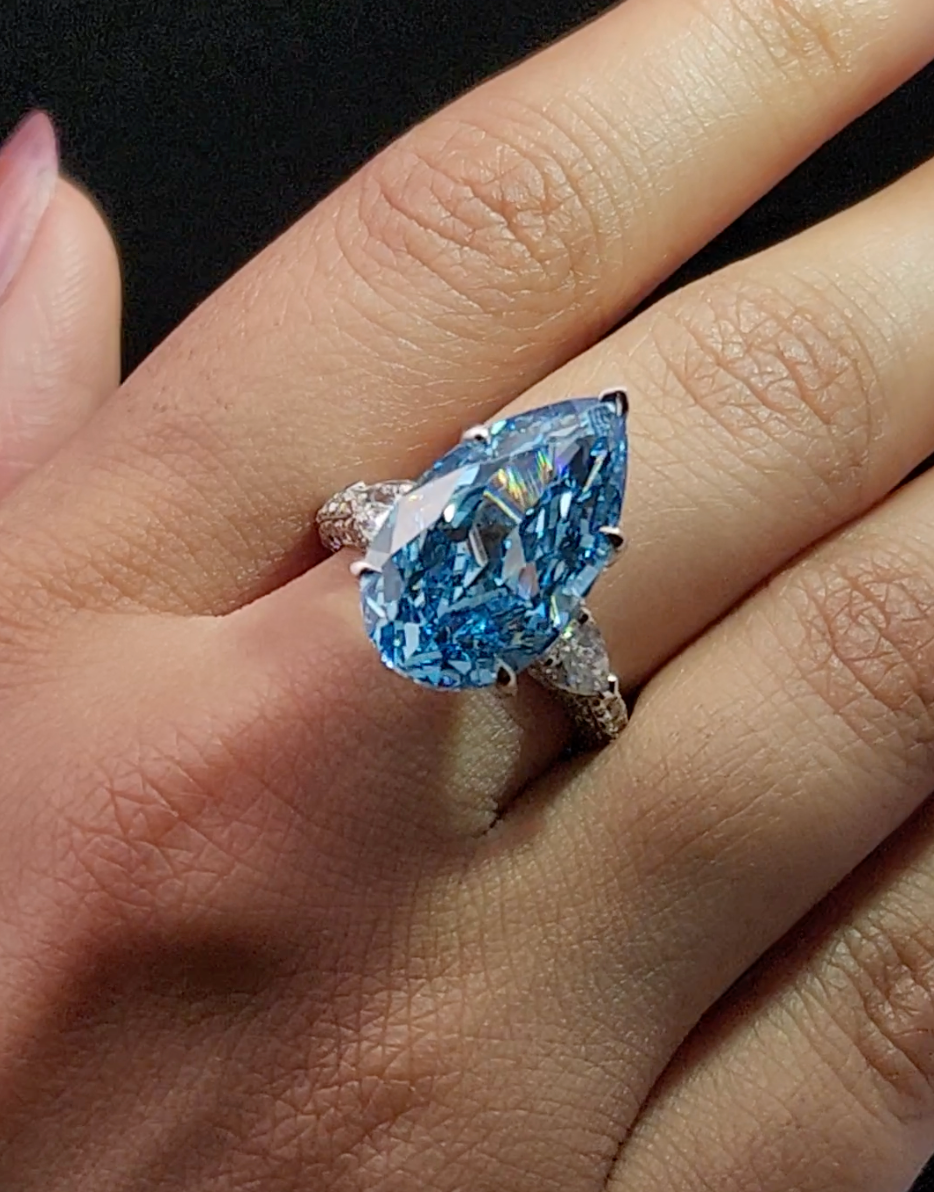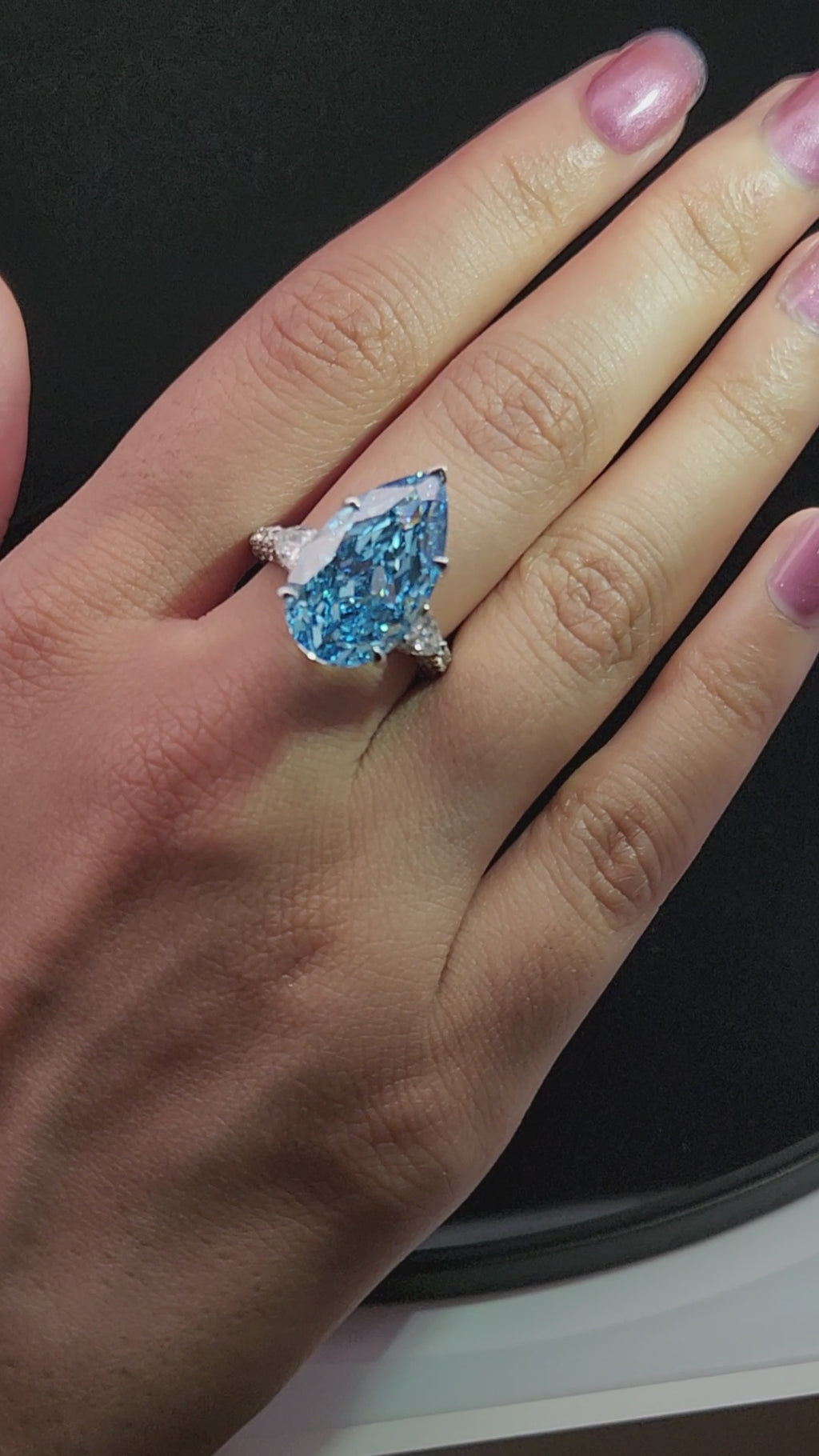 Elegant and luminous, the Aurora Bleu Band evokes the ethereal glow of dawn reflected upon still waters. At its heart lies an eleven-carat pear-cut lab-grown diamond, IGI certified for its superior craftsmanship and authenticity. Bathed in a captivating blue hue, the stone embodies calm strength and rare beauty, symbolising clarity and grace.