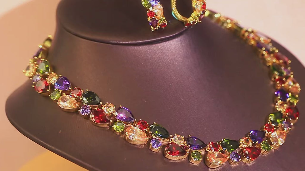 To preserve the beauty of your Royal Mosaic Necklace, keep each piece stored separately in a soft pouch or lined jewellery box to prevent scratches. Avoid exposure to water, perfumes, lotions and harsh chemicals, as these may affect the metal and plating