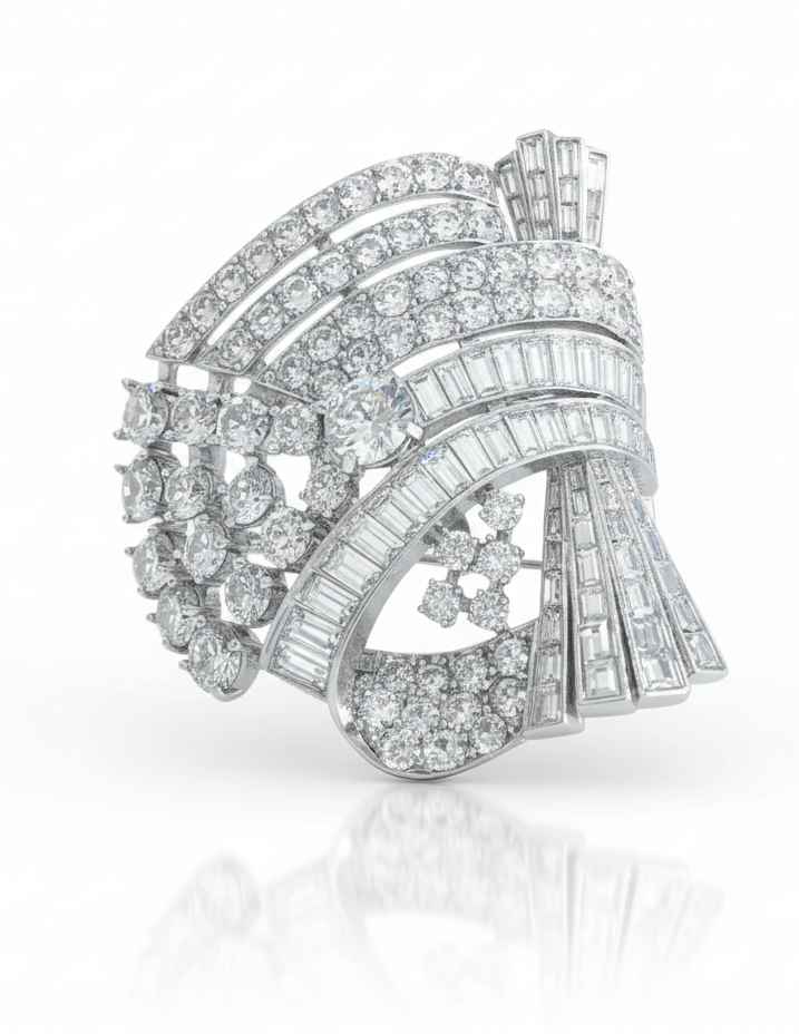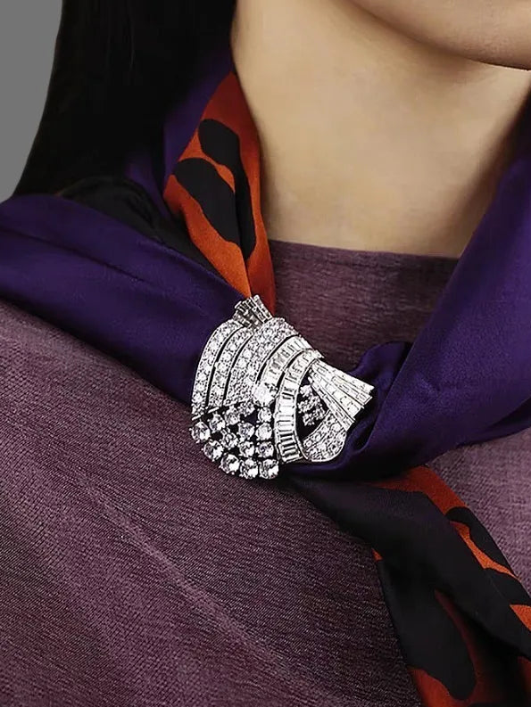 This brooch is all about movement, depth, and old-school glamour. Designed in a sculptural, cascading silhouette, it layers sweeping curves with clean geometric lines, giving it that unmistakable Art Deco confidence.