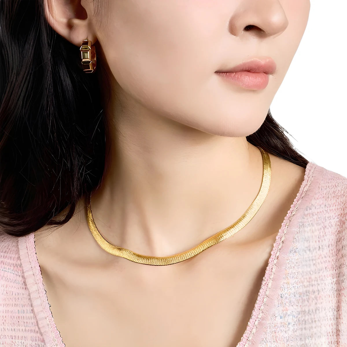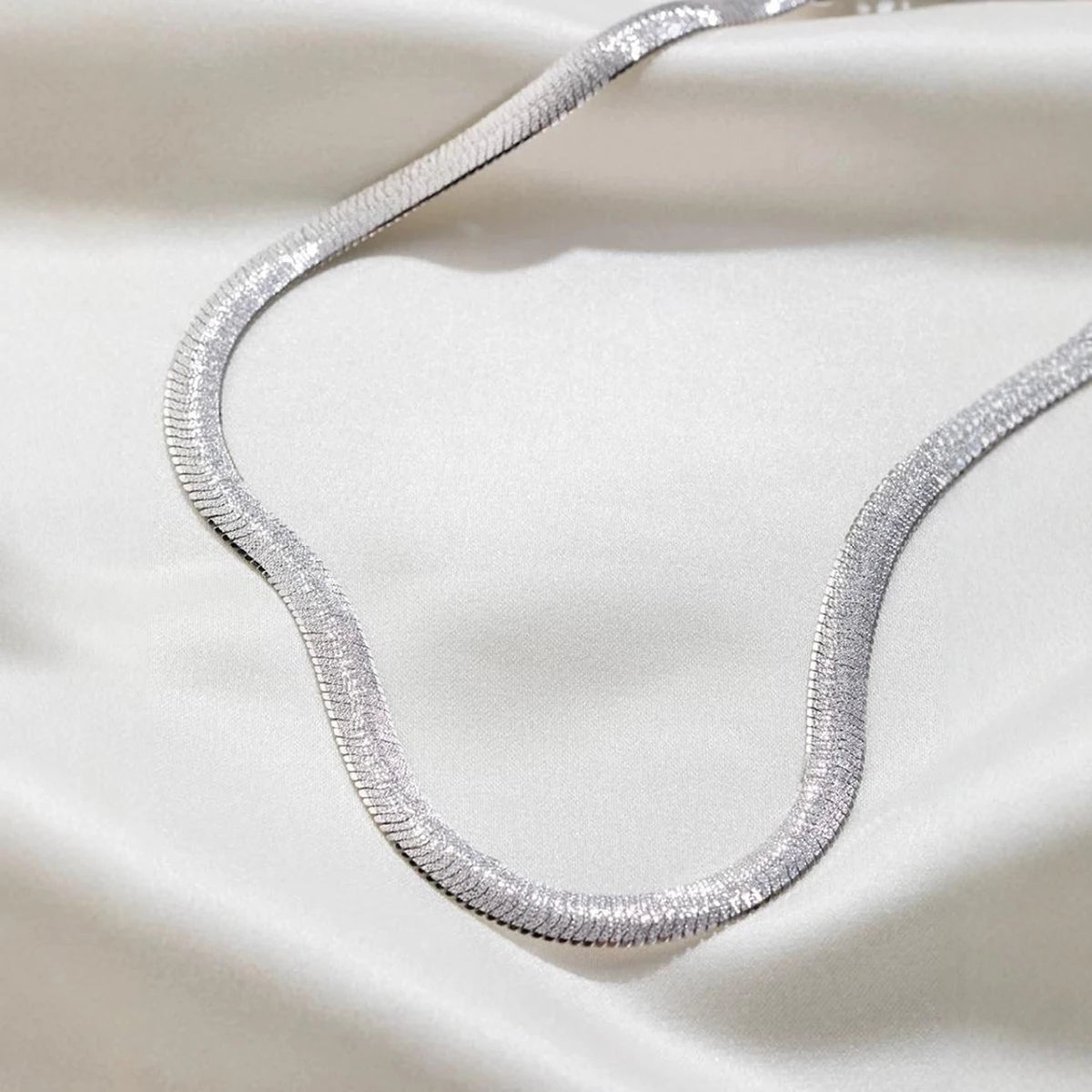Measuring 40 centimetres in length, the necklace rests gently at the collarbone as if placed there by the hands of a dream. Its sinuous shape reflects light with every motion, evoking the grace of flowing silk and the quiet strength of nature’s most captivating forms. The polished surface catches each glimmer like sunlight on still water, creating an aura of understated luxury.