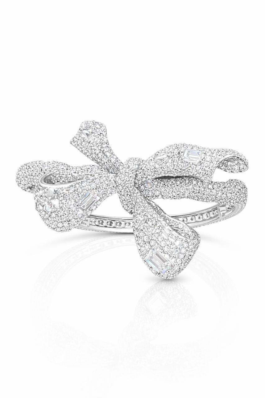 The Empress Bow Bangle is a bold, red-carpet-ready piece crafted entirely in 925 sterling silver and weighing 26 grams. Designed in the shape of a dramatic bow, it’s encrusted with lab-created white sapphires that shimmer with every movement, channelling elegance with just the right edge.