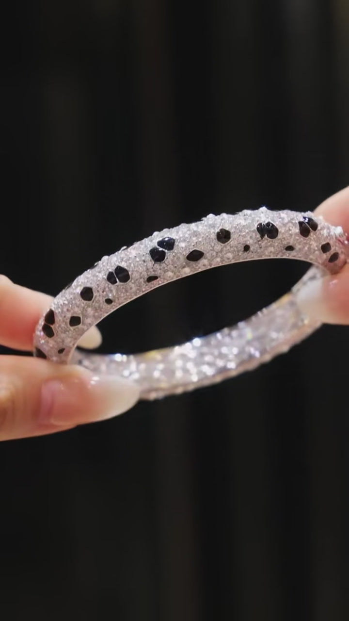 The Leopard Spots Bangle brings the beauty of untamed design into a sleek, wearable form. Crafted in 925 sterling silver and weighing 15 grams, this elegant piece is studded with lab-created sapphires that mimic the organic patterns of leopard markings, evoking a sense of both boldness and sophistication.