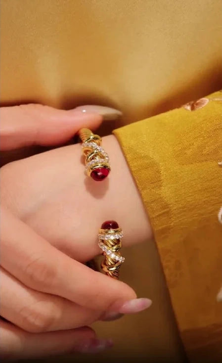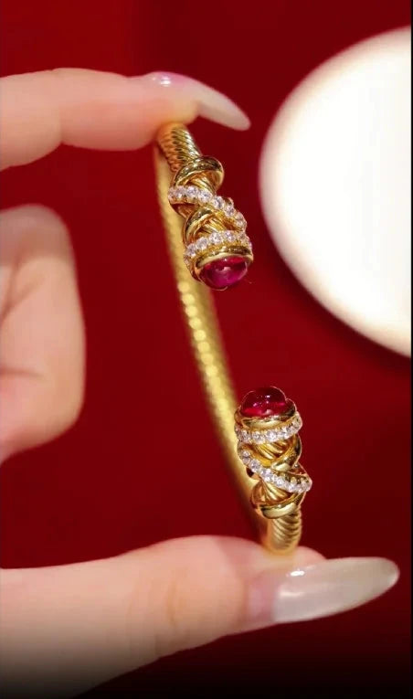 To maintain the brilliance of your Ruby Drama Bangle, avoid contact with water, perfume, and harsh chemicals. Gently polish with a soft, dry cloth and store in a fabric-lined box when not in use.