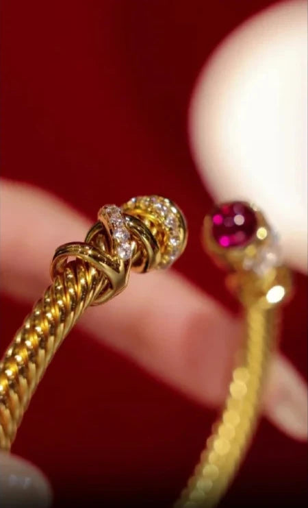 Sized at 17 centimetres, the bangle rests with graceful assurance upon the wrist, offering a perfect balance of drama and sophistication. It is a piece made for evenings that sparkle with promise and for those who carry their power with quiet fire.