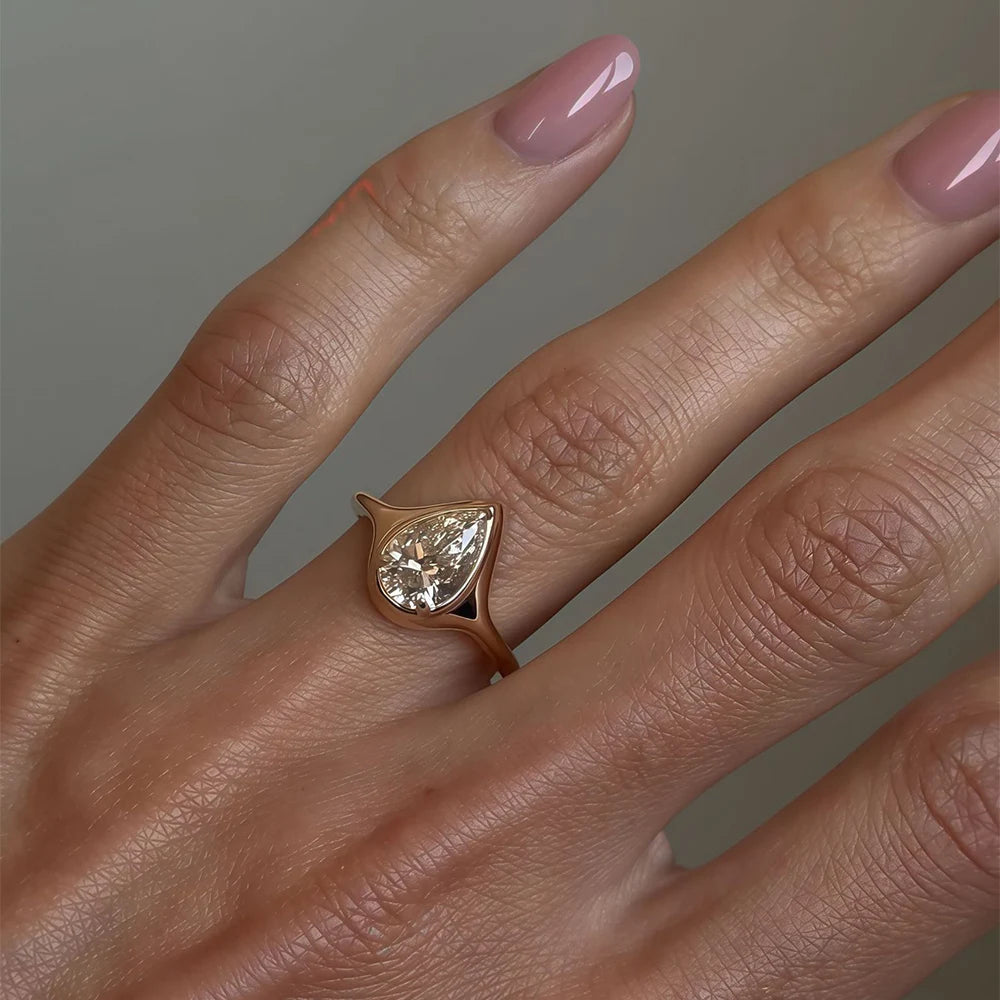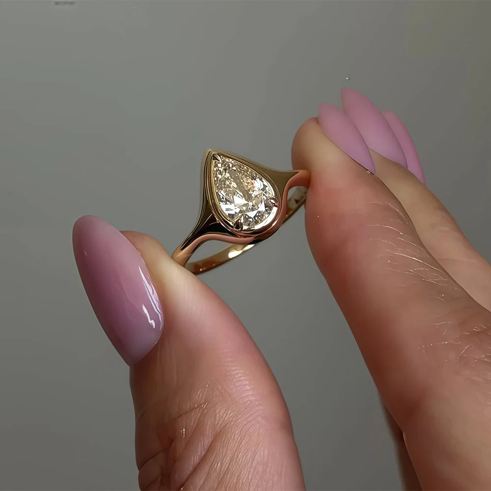 Clean, fluid, and quietly striking, the Solace Pear Ring is designed around balance and light. A 0.8 ct pear-cut D-colour moissanite sits at the centre, framed by a sculptural prong setting that follows the natural curve of the stone. The result is a ring that feels modern yet timeless, soft yet confident.