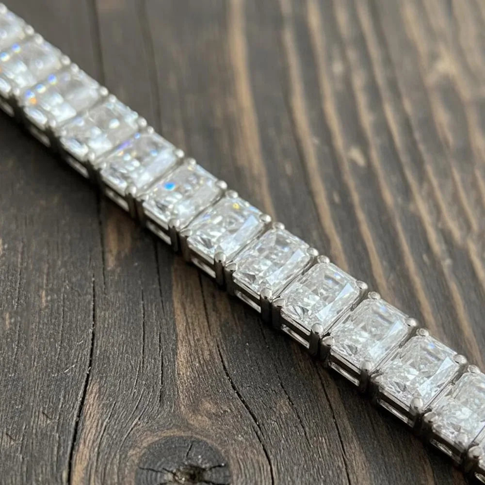 Set with carefully cut moissanite stones, each measuring three by 5 millimetres and approximately 0.5 carats, the bracelet shimmers with exceptional fire. Each stone is graded D in colour, with VVS1 clarity, and has an excellent cut, allowing light to dance seamlessly across the wrist. Crafted in 925 sterling silver, the design offers a polished, timeless finish that enhances its luminous appeal.
