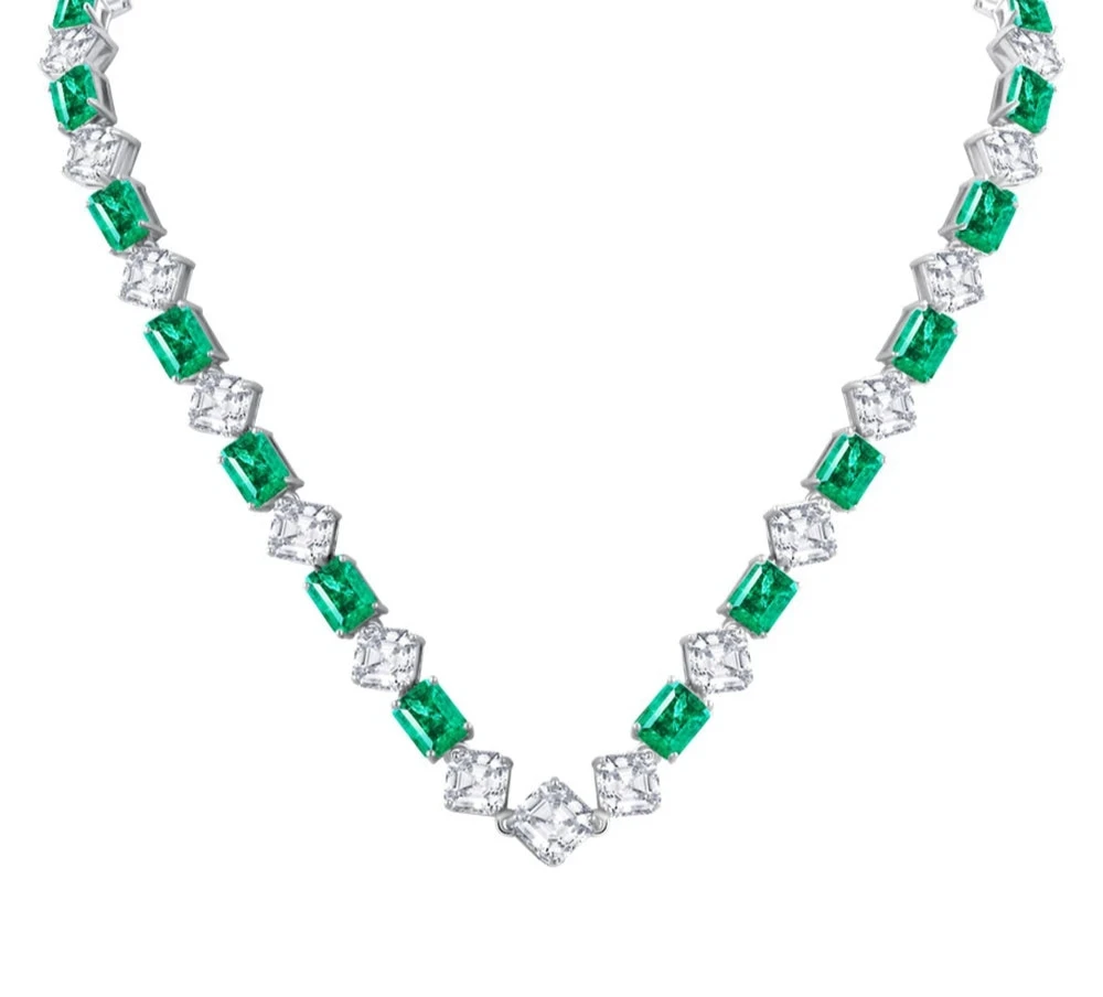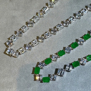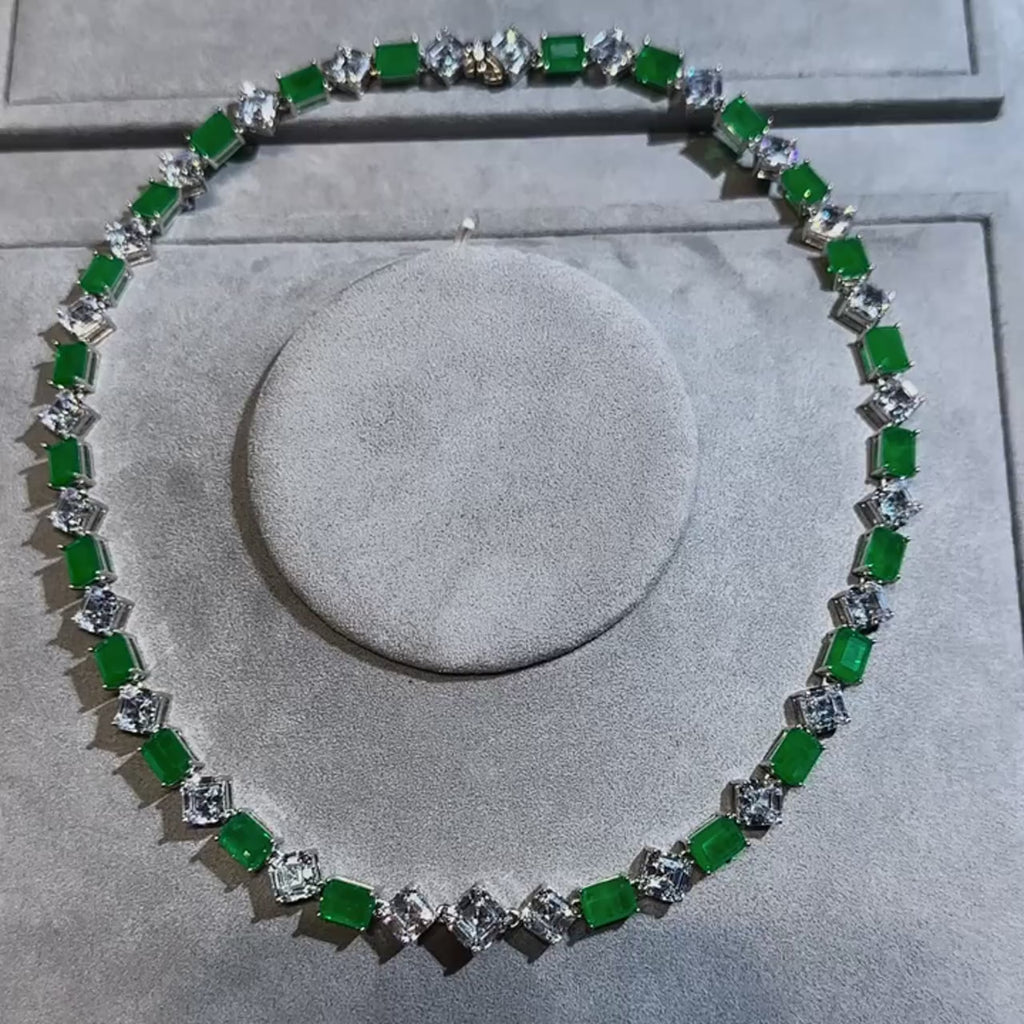 Offered in two exquisite tones, one in crisp white and the other in deep emerald green, the necklace allows you to choose your mood of magnificence. Each stone, ranging in size from seven to eight millimeters, is nestled like glistening droplets across a chain that measures 48 centimeters in length. Together, they shimmer with soft fire and timeless charm, evoking the elegance of grand halls, secret gardens, and moonlit escapes.