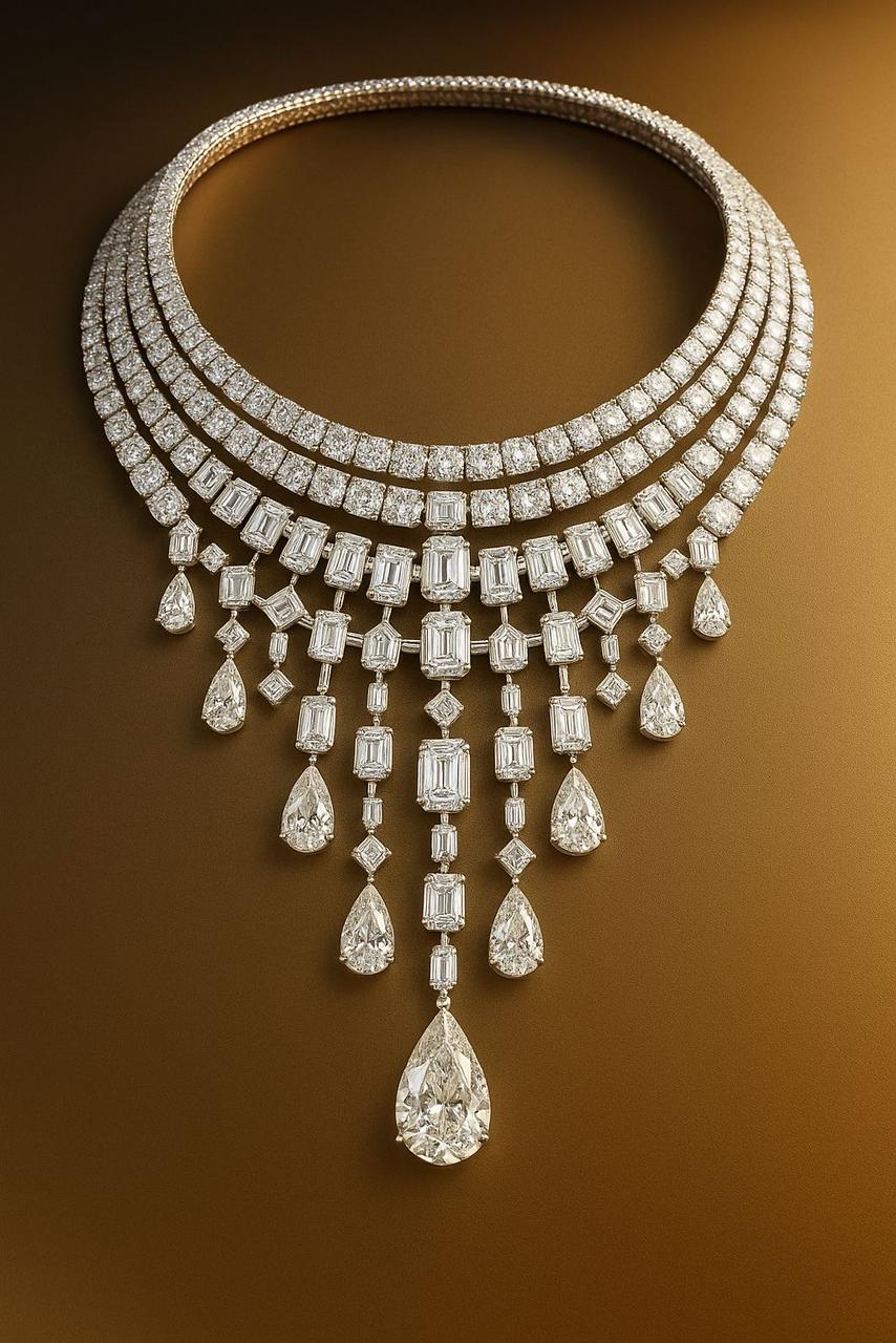The Sovereign Éclat Diamond Necklace is designed to command attention. Crafted in 18k gold and set with diamonds, this structured necklace features layered rows of round brilliant diamonds that form a robust foundation along the neckline, flowing into a dramatic cascade of emerald- and pear-shaped diamond drops.
