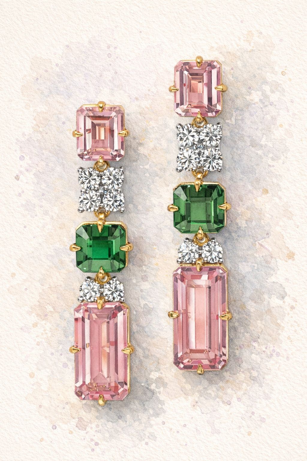 Verdant Rosé Éclat is a celebration of colour in perfect harmony. Crafted in 18k gold and set with diamonds, these earrings feature a striking vertical composition of emerald-cut pink and green gemstones, punctuated by brilliant diamond clusters that bring light and balance to the design.