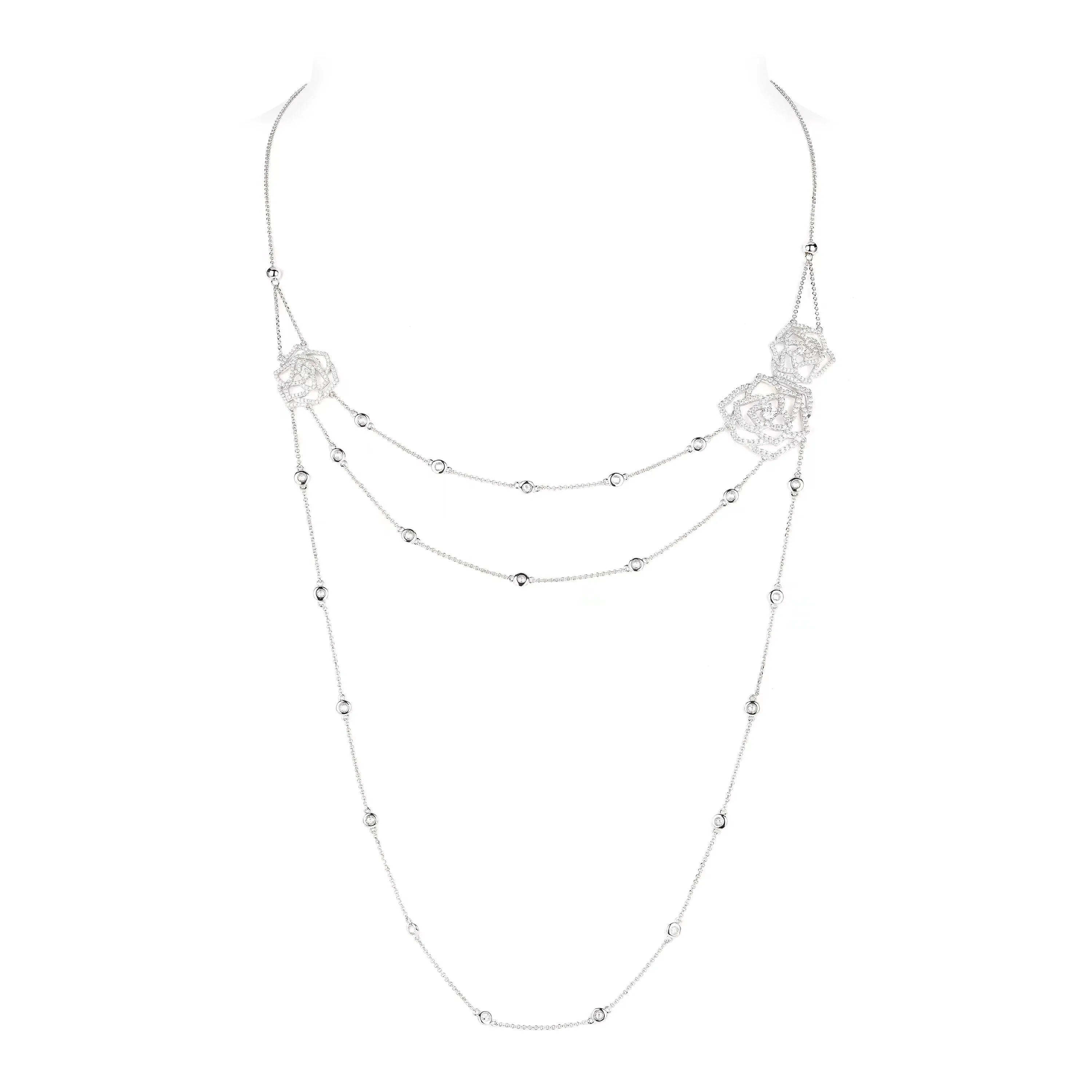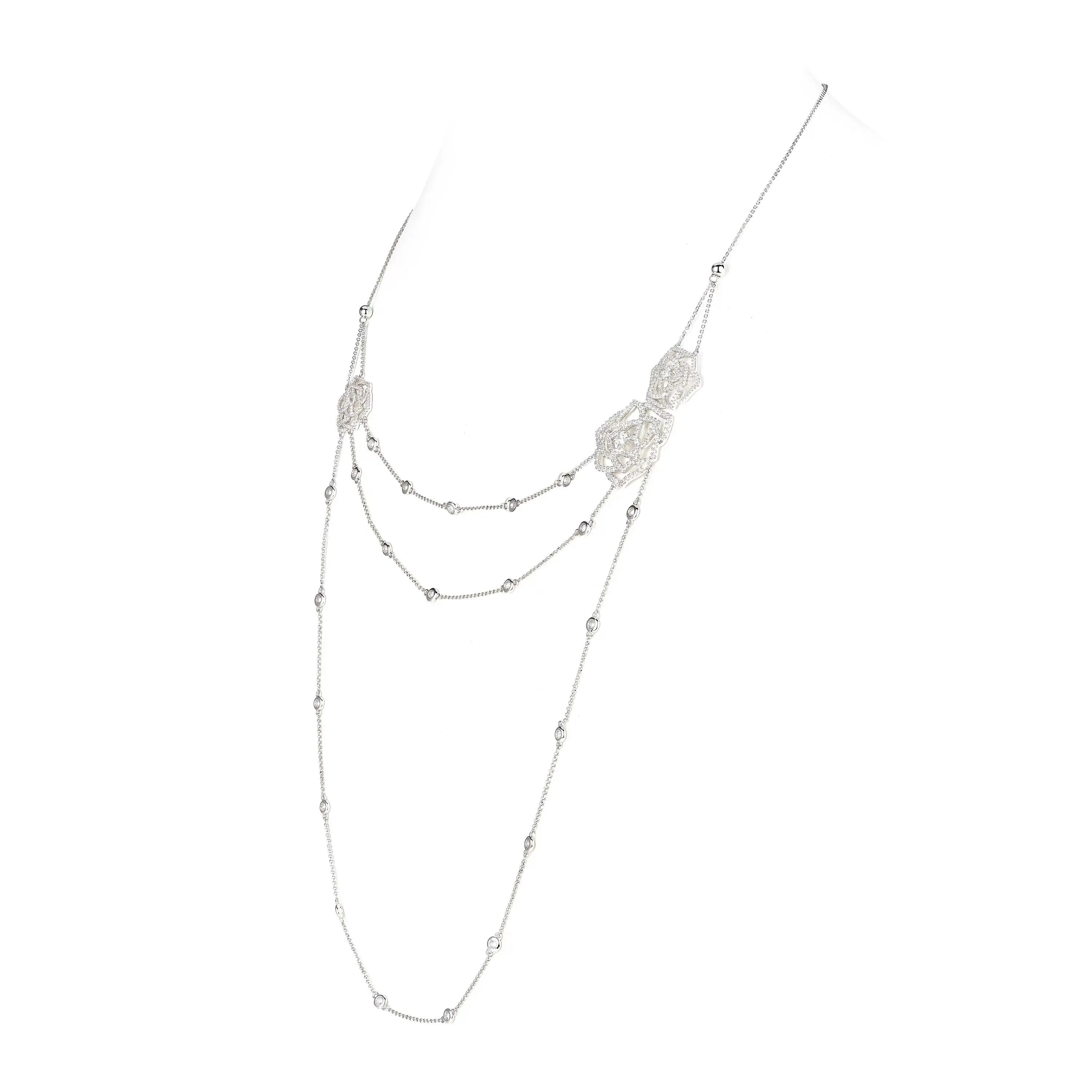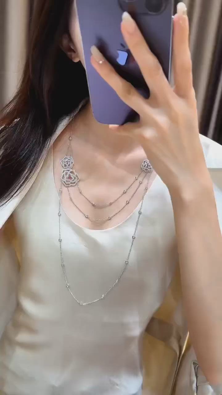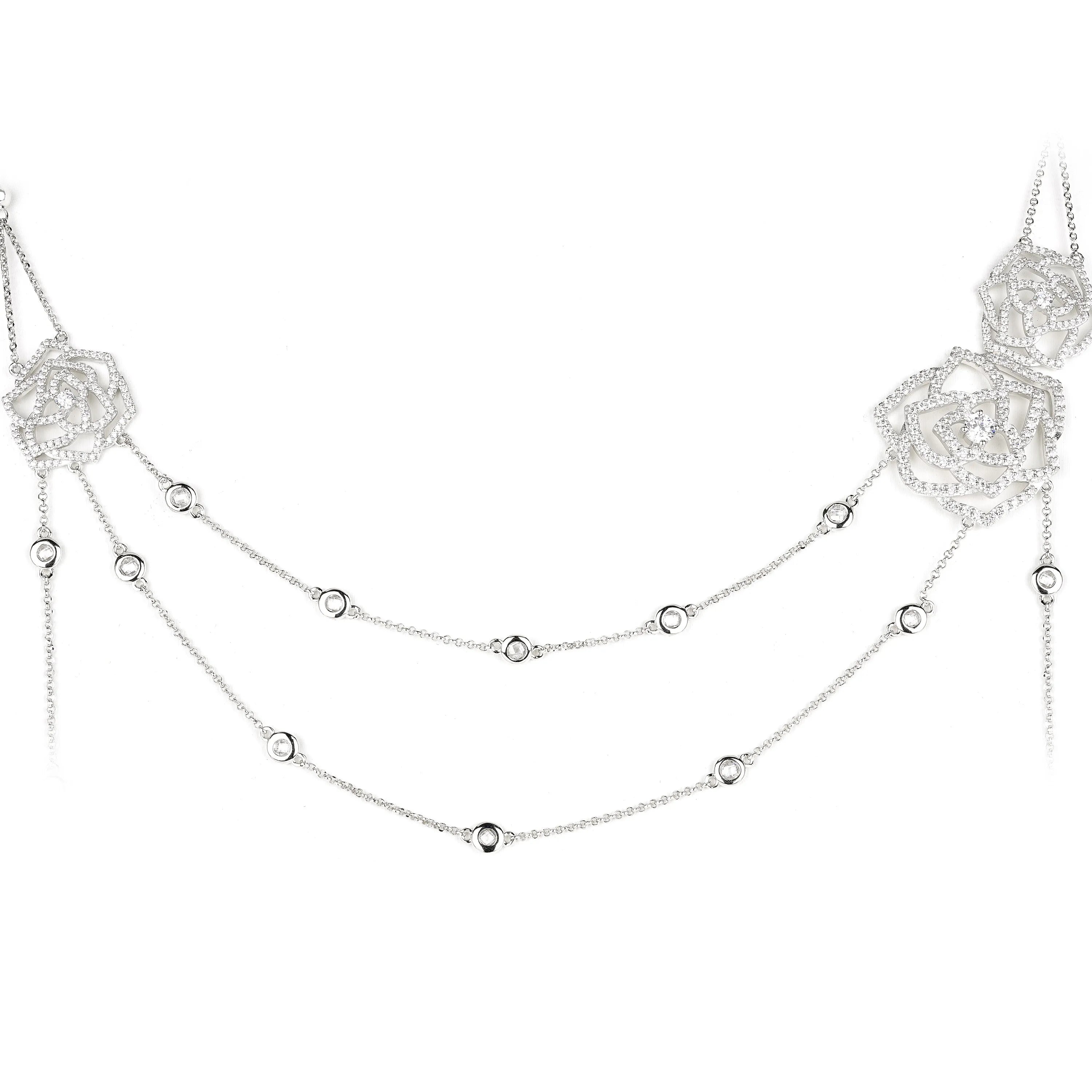A delicate waltz of silver and sparkle, the Rose Layered Necklace is an ode to quiet glamour. Crafted in 925 sterling silver, it is adorned with intricate openwork roses and shimmering lab sapphires that glisten like stardust caught on petals. Each side stone adds a glimmering note, reflecting the grace of twilight garden blooms.