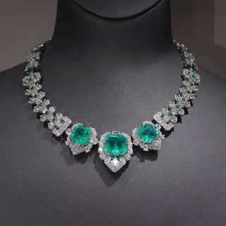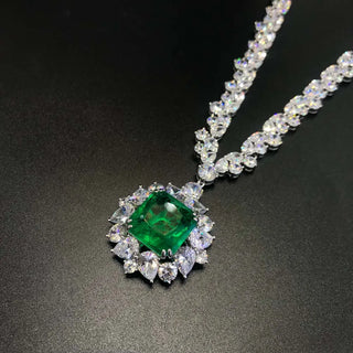 Sculptural sterling silver pendant necklace featuring emerald and white lab sapphires in a bamboo-inspired design.