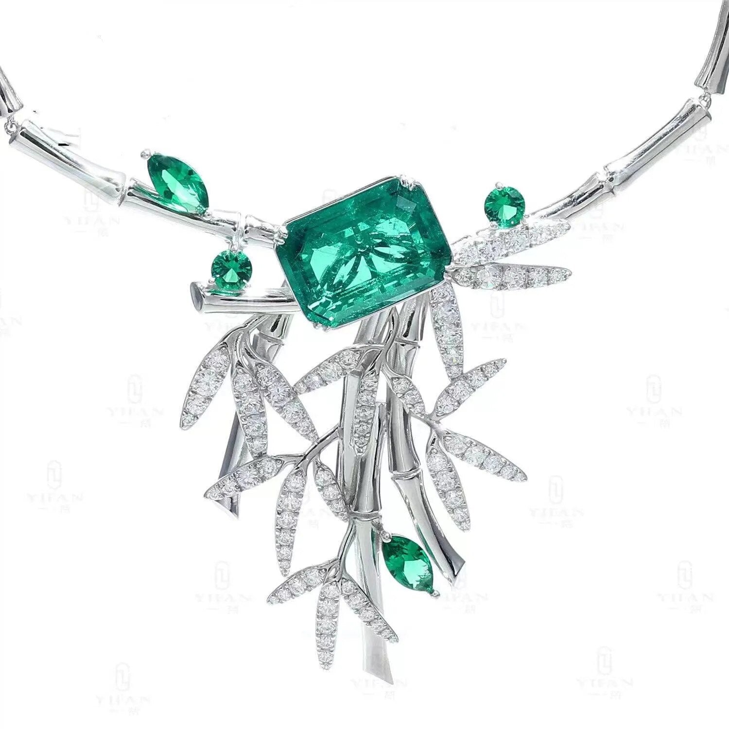 Sculptural, sleek, and quietly bold, the Bamboo Emerald Pendant Necklace is where minimalism meets drama. Handcrafted in solid 925 sterling silver and weighing 40 grams, this piece features a striking interplay of synthetic emeralds and white lab-created sapphires, set to mimic the graceful lines of bamboo. It’s a fresh take on classic green, elevated with just the right sparkle.