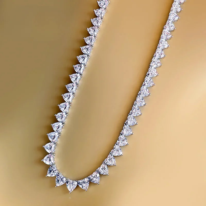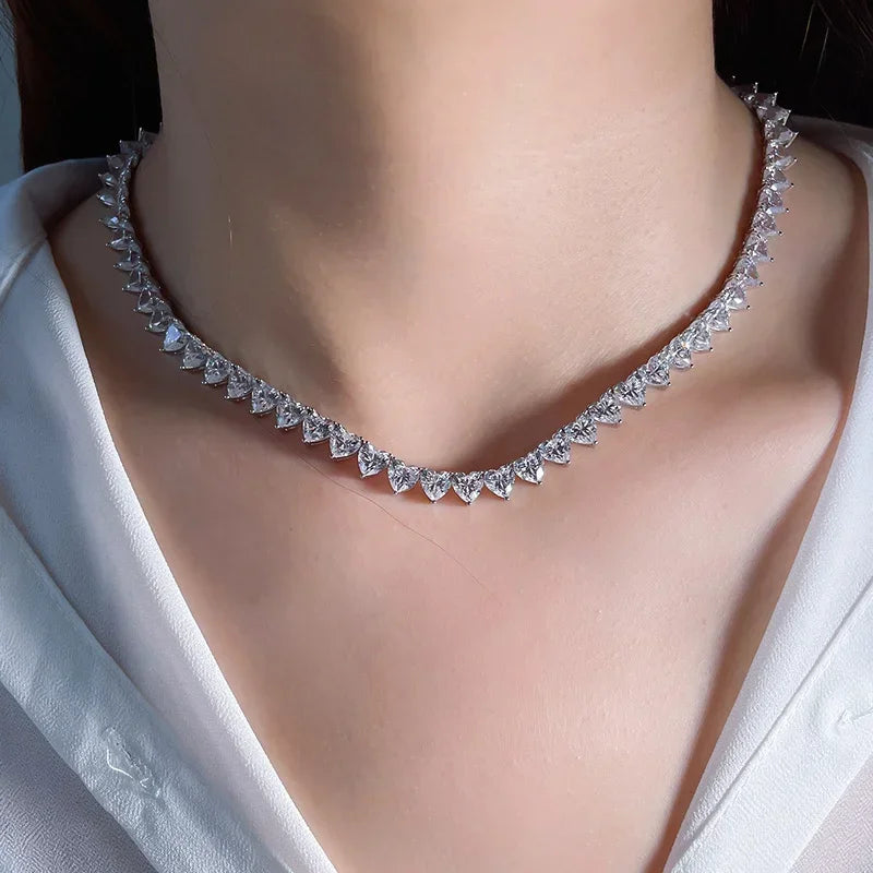 A delicate expression of affection, the Heart Tennis Necklace brings together the brilliance of Moissanite with the timeless charm of a classic silhouette. Each shimmering stone is meticulously set in sterling silver, forming a graceful rhythm of light that traces the neckline with quiet elegance.